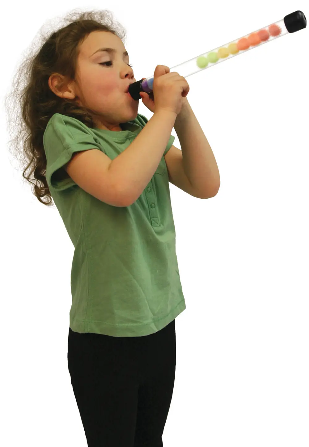 Schon optisch ist er ein Hingucker: eine durchsichtige Röhre mit bunten Bällen und einem Mundstück. Wenn ich sauge oder blase, sieht man, wie sich die weichen Pomponbälle nach oben oder unten bewegen.