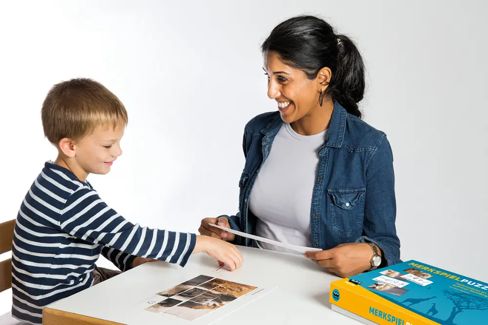 Für Kinder mit Lesekompetenz gibt es das Merkspielpuzzle 2, das die Übungen sinnvoll weiterführt.