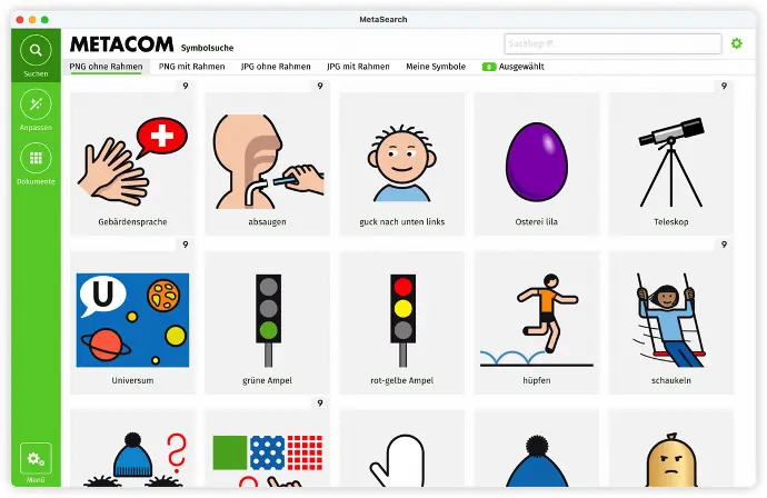 METACOM 9 Desktop zum Erstellen von Materialien zur Unterstützten Kommunikation besteht aus der METACOM 9 Symbolsammlung und dem Programm MetaSearch. Die Symbolsammlung umfasst in der Version 9 ca. 17000 Symbole, die den Ruf genießen, besonders klar und leicht erkennbar zu sein. MetaSearch stellt nicht nur eine Stichwortsuchfunktion in den Sprachen Deutsch, Englisch, Französisch, Italienisch, Niederländisch, Spanisch und Schwedisch zur Verfügung, mit der sich passende Symbole schnell finden lassen. Vielfältige Bearbeitungsfunktionen und die Möglichkeit, in MetaSearch Dokumente zu erstellen, werden durch ein umfangreiches kostenloses Download-Angebot leicht anpassbarer Vorlagen ergänzt.