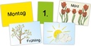 90 Karten für Datum, Wochentag, Monat, Jahr, Jahreszeit, Wetter, Geburtstag, gestern-heute-morgen. Zusätzlich sind die Textkarten auch mit Beschriftungen in Englisch enthalten.