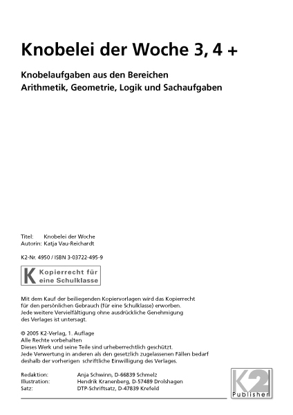 Material, um während zwei Schuljahren wöchentlich eine Knobelaufgabe aus den Bereichen Wahrnehmung, Arithmetik, Geometrie, Logik oder Sachrechnen zu bearbeiten.