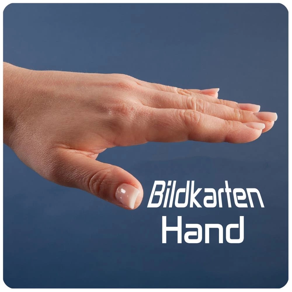 Das Spiegeltherapie Bildkarten Set besteht aus 54 Bildern von linken und rechten Händen auf robusten plastifizierten Karten und einem nicht-permanenten Stift zum Beschriften der Karten-Rückseite.